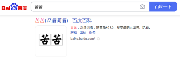 在對(duì)商標(biāo)進(jìn)行含義解釋時(shí),萬(wàn)不可將其割裂開來(lái),進(jìn)行個(gè)字認(rèn)讀,應(yīng)以商標(biāo)整體構(gòu)成要素進(jìn)行統(tǒng)一認(rèn)讀。申請(qǐng)商標(biāo)“苦苦”為統(tǒng)一而不可分割的整體,系固有詞匯,具有固定的含義指向。常見于相關(guān)公眾的口語(yǔ)表述中,如辛辛苦苦、苦苦哀求等詞語(yǔ),具有堅(jiān)決、執(zhí)著、懇切等含義。