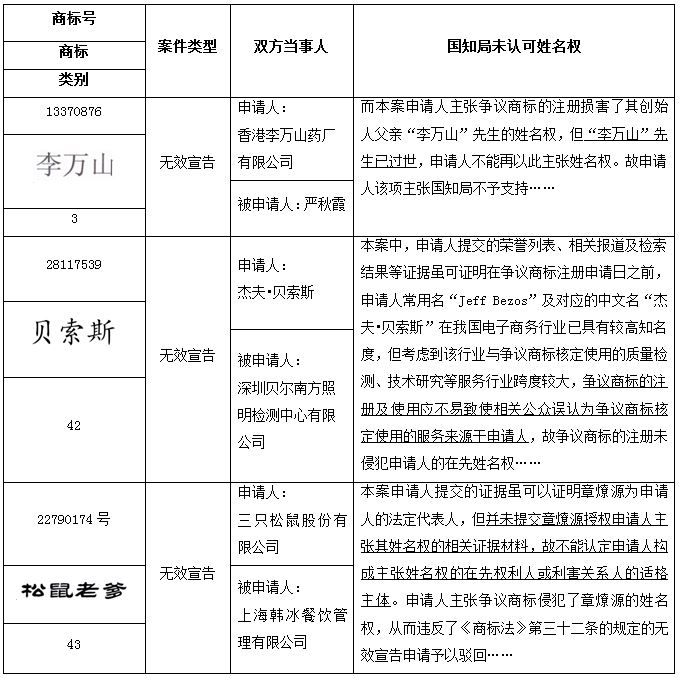 然而,在下述無效案件中,國知局并未對姓名權(quán)予以認(rèn)可,請見如下表格: