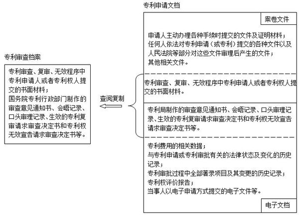 專(zhuān)利審查檔案,包括專(zhuān)利審查、復(fù)審、無(wú)效程序中專(zhuān)利申請(qǐng)人或者專(zhuān)利權(quán)人提交的書(shū)面材料,國(guó)務(wù)院專(zhuān)利行政部門(mén)制作的審查意見(jiàn)通知書(shū)、會(huì)晤記錄、口頭審理記錄、生效的專(zhuān)利復(fù)審請(qǐng)求審查決定書(shū)和專(zhuān)利權(quán)無(wú)效宣告請(qǐng)求審查決定書(shū)等。