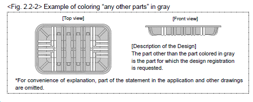 當(dāng)通過著色來區(qū)分保護部分和不保護部分時,同時在外觀設(shè)計說明中應(yīng)指出“除著色部分(如除灰色部分)以外的任何部分”是作為部分外觀設(shè)計請求進行保護的部分,如下圖10所示。可以看出,這一點跟歐美的涂覆或者淡化處理是有所區(qū)別的,日本允許用不同的顏色加上語言說明來進行區(qū)分。