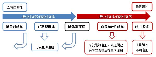 根據(jù)《審查指南》第1209.01條,商標(biāo)的描述性可被理解為一個“顯著性/描述性統(tǒng)一體”,也即商標(biāo)的顯著性和描述性是一個相對的概念,申請商標(biāo)在指定商品/服務(wù)上的描述性越強(qiáng),顯著性越弱。前述“顯著性/描述性統(tǒng)一體”以及商標(biāo)描述性程度劃分如下圖所示: