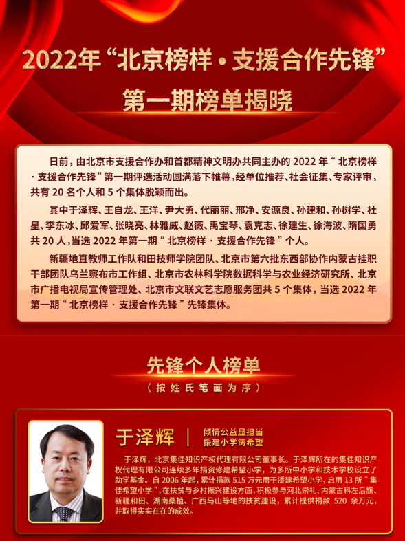 近日,由北京市支援合作辦公室和首都精神文明辦公室共同主辦的2022年“北京榜樣?支援合作先鋒”第一期評選活動圓滿落下帷幕,經(jīng)單位推薦、社會征集、專家評審,共有20名個人和5個集體脫穎而出,集佳于澤輝所長榮登“先鋒個人榜單”!