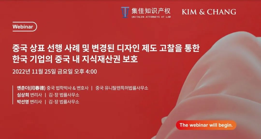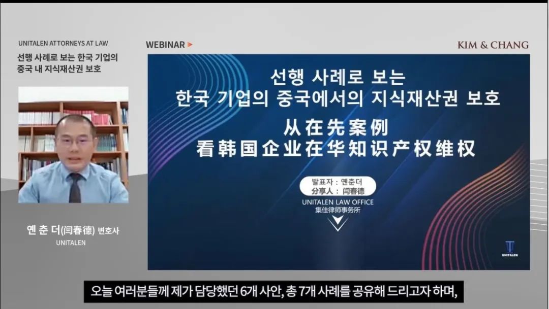 應(yīng)韓國金張律師事務(wù)所邀請(qǐng),2022年11月25日,集佳合伙人閆春德律師通過網(wǎng)絡(luò)研討會(huì)形式,為韓國企業(yè)作“韓企在華知識(shí)產(chǎn)權(quán)維權(quán)”專題講座。合伙人鄭毅律師全程參與本次講座與韓方的溝通與組織協(xié)調(diào)工作。