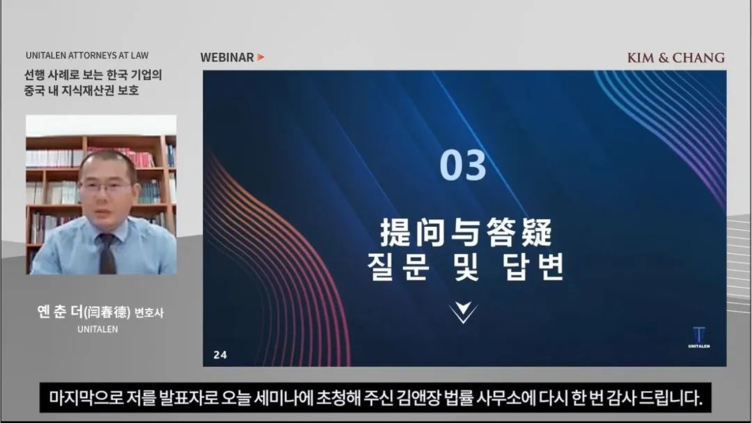 本次講座受到了眾多韓國知名企業(yè)的歡迎,韓國電腦游戲公司NEXON(??)、食品企業(yè)希杰第一制糖(CJ????)、DB保險(xiǎn)公司、三星顯示器株式會(huì)社(???????)、速食拉面老牌三養(yǎng)食品(????)、醬類食品代表企業(yè)膳府(??)、化妝品集團(tuán)愛茉莉太平洋(??????)、高壓電飯煲代表企業(yè)酷晨CUCHEN(??)、醫(yī)美代表企業(yè)科萊西斯CLASSYS(????)、美妝品牌Have&Be(????)等來自不同行業(yè)企業(yè)的知識(shí)產(chǎn)權(quán)負(fù)責(zé)人以及金張律師事務(wù)所的律師與代理師在線聆聽了本次講座。金張律師事務(wù)所表示,會(huì)后大家反響相當(dāng)熱烈,一致認(rèn)為閆律師演講的案例和內(nèi)容非常豐富,對(duì)于理解中國最新實(shí)務(wù)很有幫助。金張律所表示,期待今后雙方能有更多的合作交流!