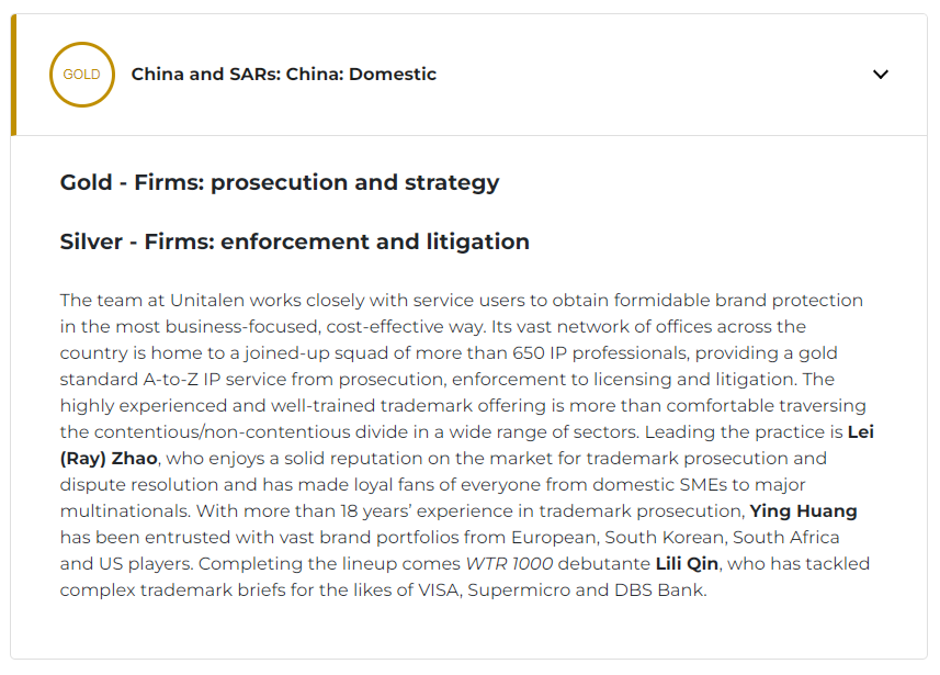 WTR評(píng)價(jià):“作為團(tuán)隊(duì)的領(lǐng)軍人物,趙雷律師在商標(biāo)申請(qǐng)和爭端解決方面享有卓著聲譽(yù),在從國內(nèi)中小企業(yè)到大型跨國公司中都擁有的忠實(shí)擁躉?!?/em>