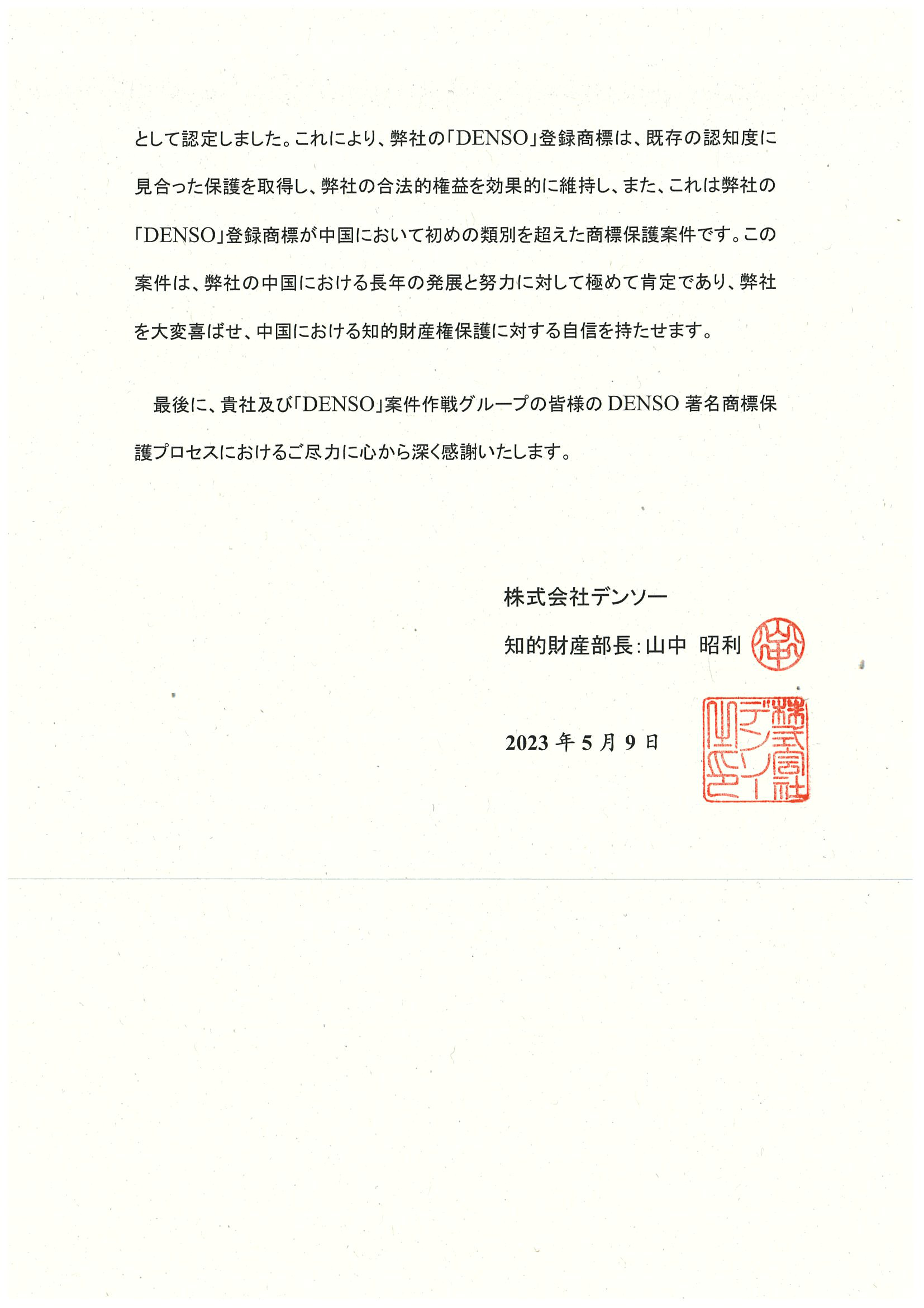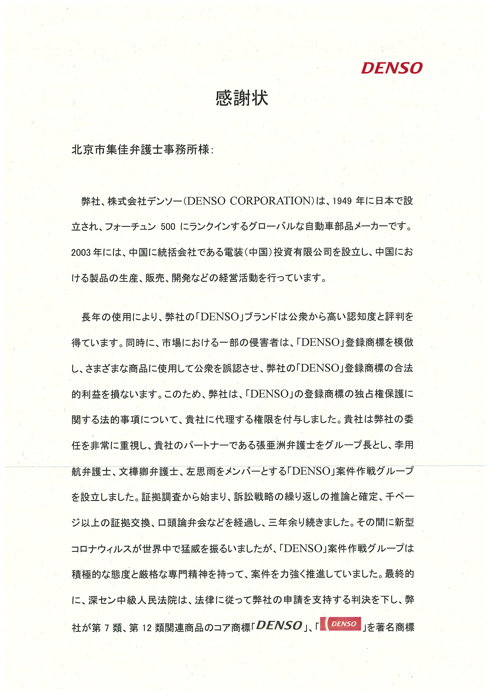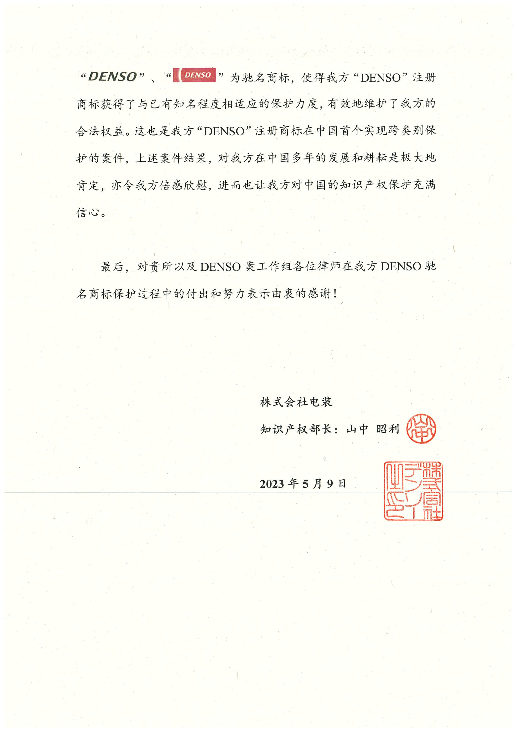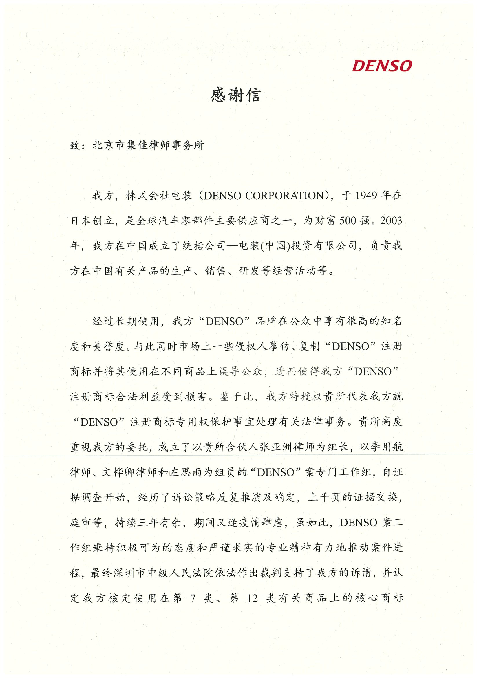 上述案件是“DENSO”注冊商標(biāo)在中國首個(gè)實(shí)現(xiàn)跨類別保護(hù)的案件,通過該案,集佳成功代理客戶使其“DENSO”注冊商標(biāo)獲得了與已有知名程度相適應(yīng)的保護(hù)力度,有效地維護(hù)了客戶的合法權(quán)益。
