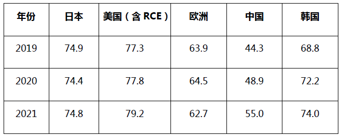 近三年五局發(fā)明授權率對比:(單位:百分比)