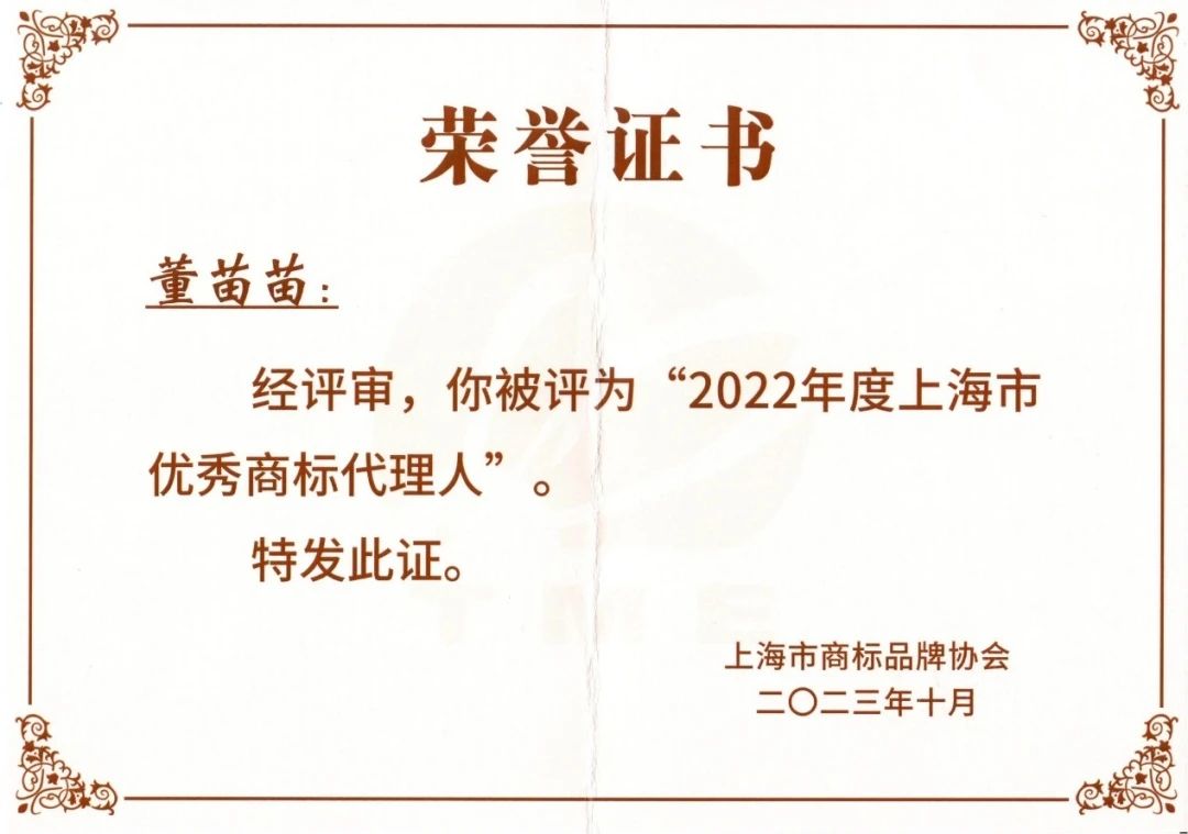 集佳上海分所董苗苗律師被評為2022年度“上海市優(yōu)秀商標(biāo)代理人”。