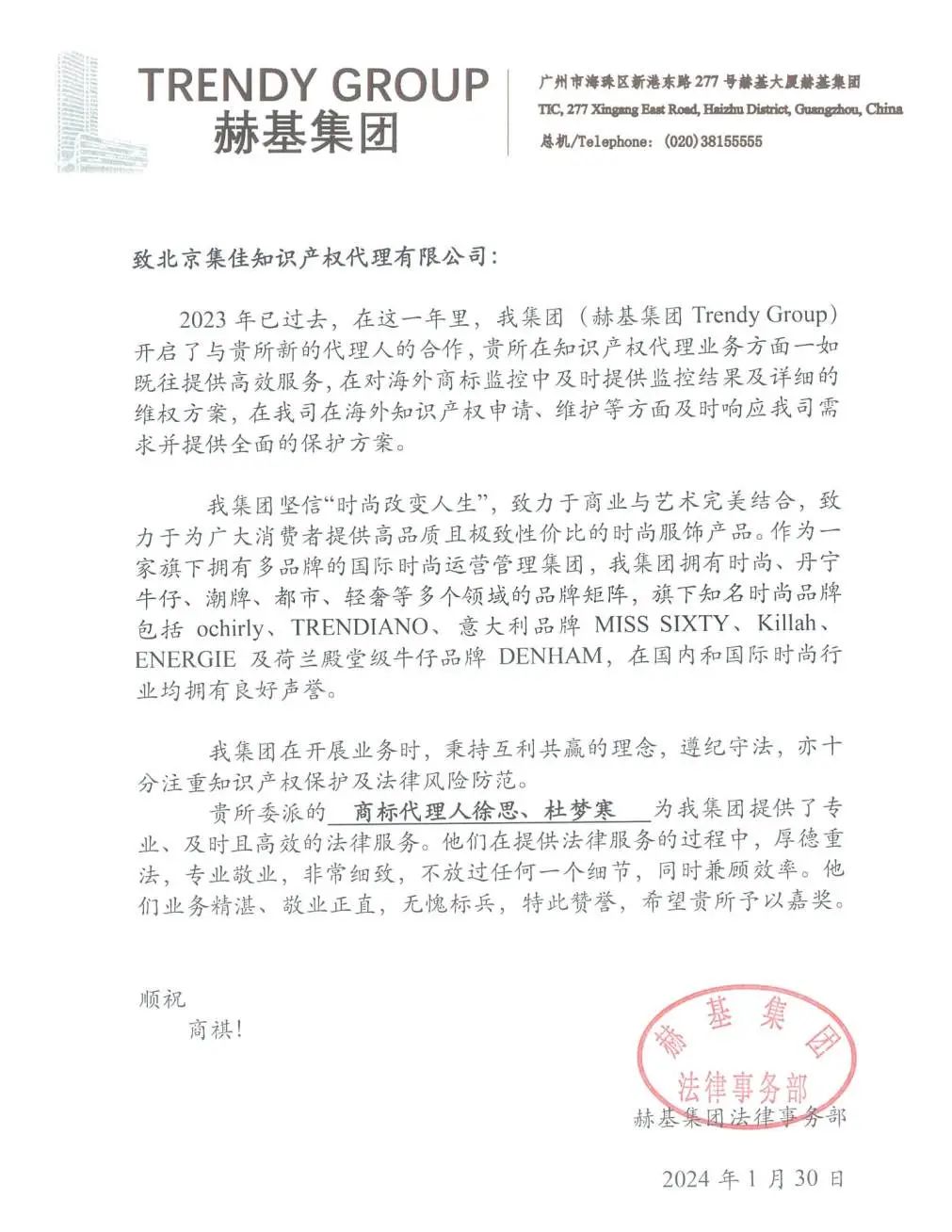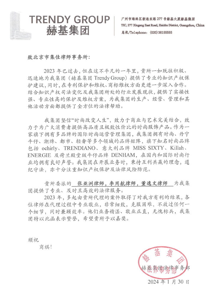 信中提到,2023年,集佳與赫基集團在專利保護和維權、商標維權方面更進一步加強合作,集佳一如既往、迅速地為赫基集團提供了專業(yè)的知識產(chǎn)權保護建議,集佳提供的實操性強、專業(yè)性高的保護及維權方案,為赫基集團的生產(chǎn)、經(jīng)營、管理和其他活動方面都提供了全方位的法律幫助。赫基集團法務部贊揚集佳張亞洲律師、李用航律師、董逸文律師、徐思律師、商標代理人杜夢寒等,在提供專業(yè)、及時且高效的法律服務的過程中,厚德重法,業(yè)務精湛,敬業(yè)正直,無愧標兵。