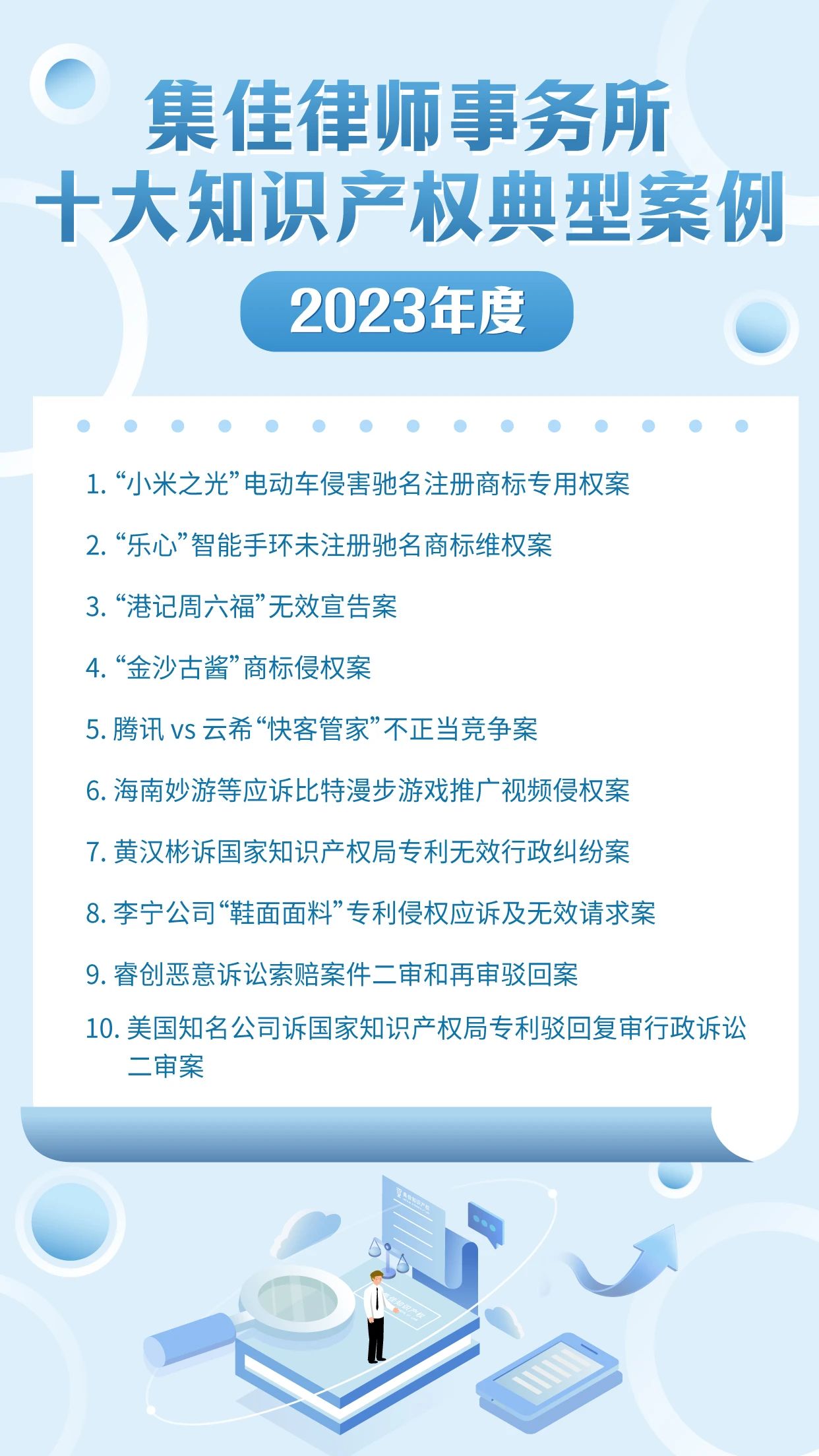 作為迎接4.26世界知識(shí)產(chǎn)權(quán)日的獻(xiàn)禮之一,北京市集佳律師事務(wù)所已連續(xù)十年開(kāi)展十大知識(shí)產(chǎn)權(quán)典型案例的評(píng)選活動(dòng),其意義不僅在于展現(xiàn)集佳律師團(tuán)隊(duì)的專(zhuān)業(yè)能力和水準(zhǔn),更在于傳遞集佳全方位服務(wù)客戶(hù)的理念。在第24個(gè)世界知識(shí)產(chǎn)權(quán)日來(lái)臨之際,集佳律所從2023年度代理的眾多知識(shí)產(chǎn)權(quán)案件中篩選出具有代表性的十大案例,與各界同仁分享: