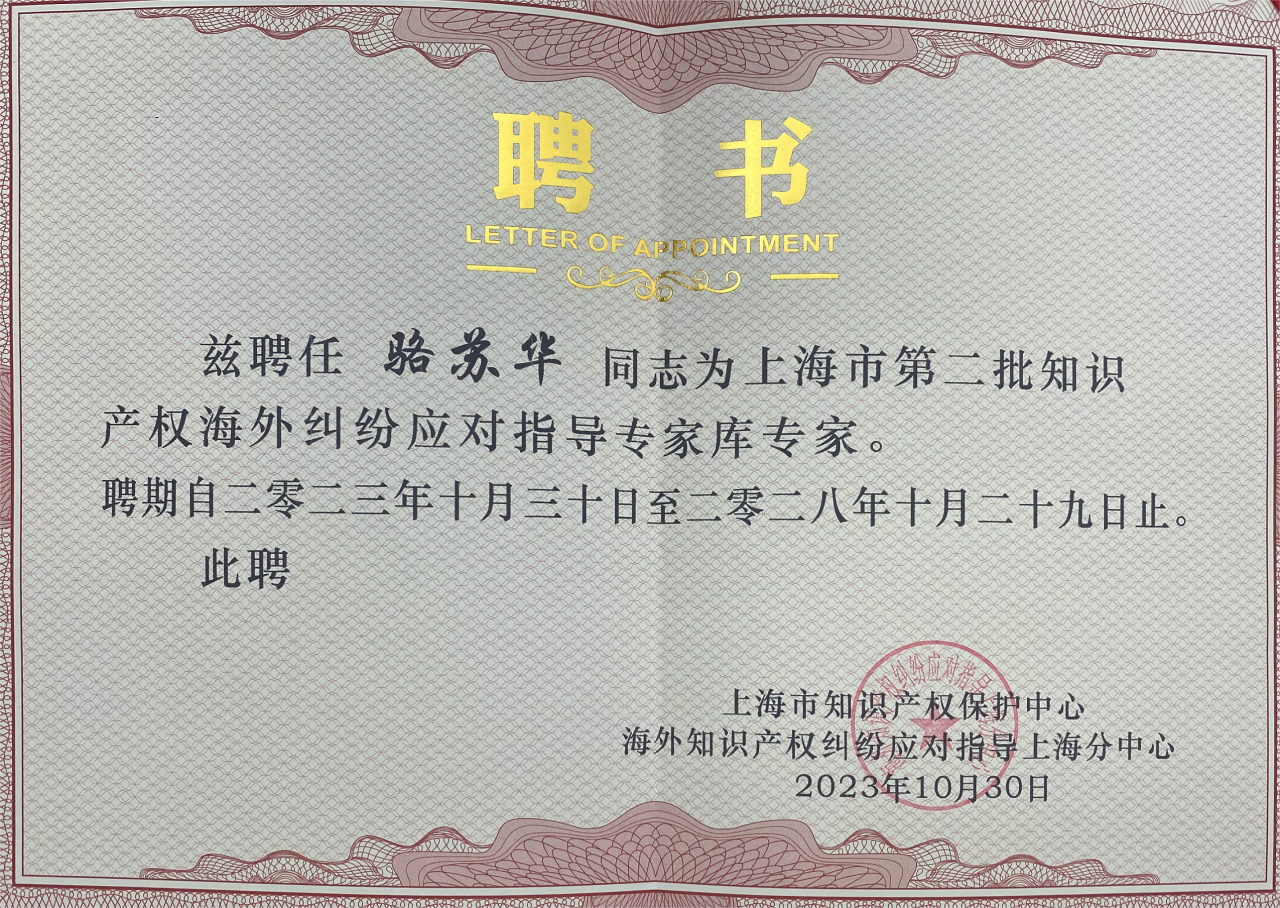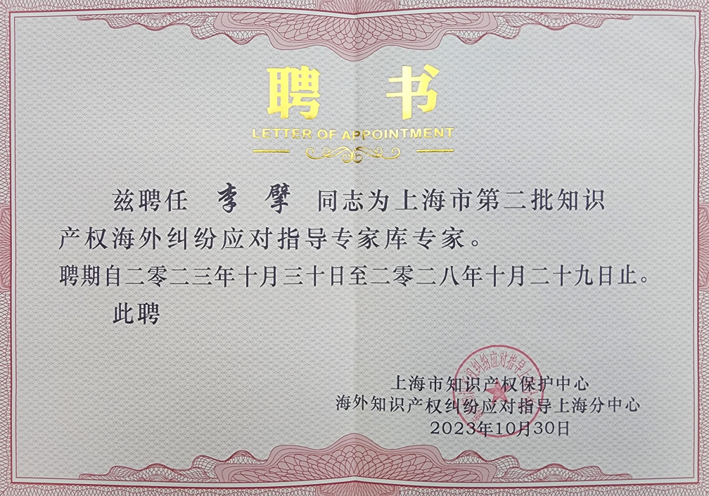 集佳上海分所合伙人駱蘇華博士、合伙人李擘律師獲聘成為上海市知識產(chǎn)權(quán)保護(hù)中心第二批海外維權(quán)援助專家(上海市第二批知識產(chǎn)權(quán)海外糾紛應(yīng)對指導(dǎo)專家?guī)鞂<遥吆鐦驀H中央商務(wù)區(qū)海外維權(quán)援助基地首批專家。