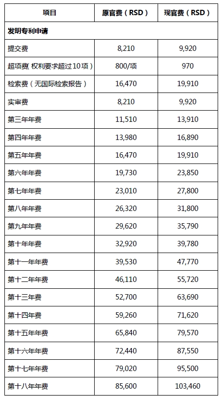2024年8月1日起,塞爾維亞上調(diào)與知識(shí)產(chǎn)權(quán)相關(guān)的官費(fèi),上調(diào)幅度約為5%,與發(fā)明和實(shí)用新型專利申請相關(guān)的官費(fèi)如下: