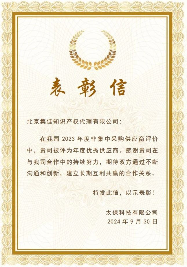 近日,集佳喜獲客戶太??萍加邢薰镜谋碚眯牛谟杓选澳甓葍?yōu)秀供應(yīng)商”榮譽(yù)稱(chēng)號(hào),感謝集佳在與太保科技合作中的持續(xù)努力,并期待雙方通過(guò)不斷溝通和創(chuàng)新,建立長(zhǎng)期互利共贏的合作關(guān)系。