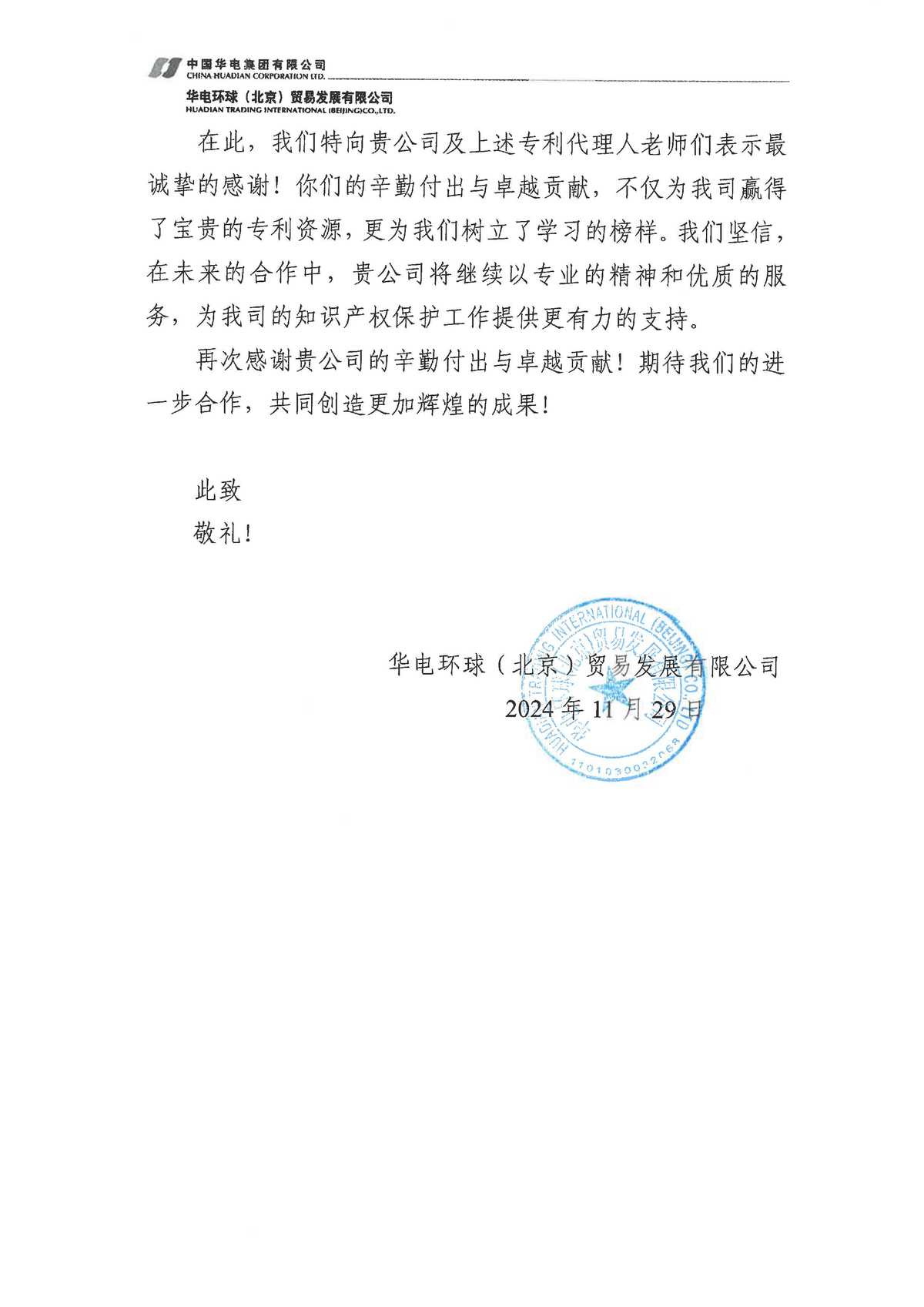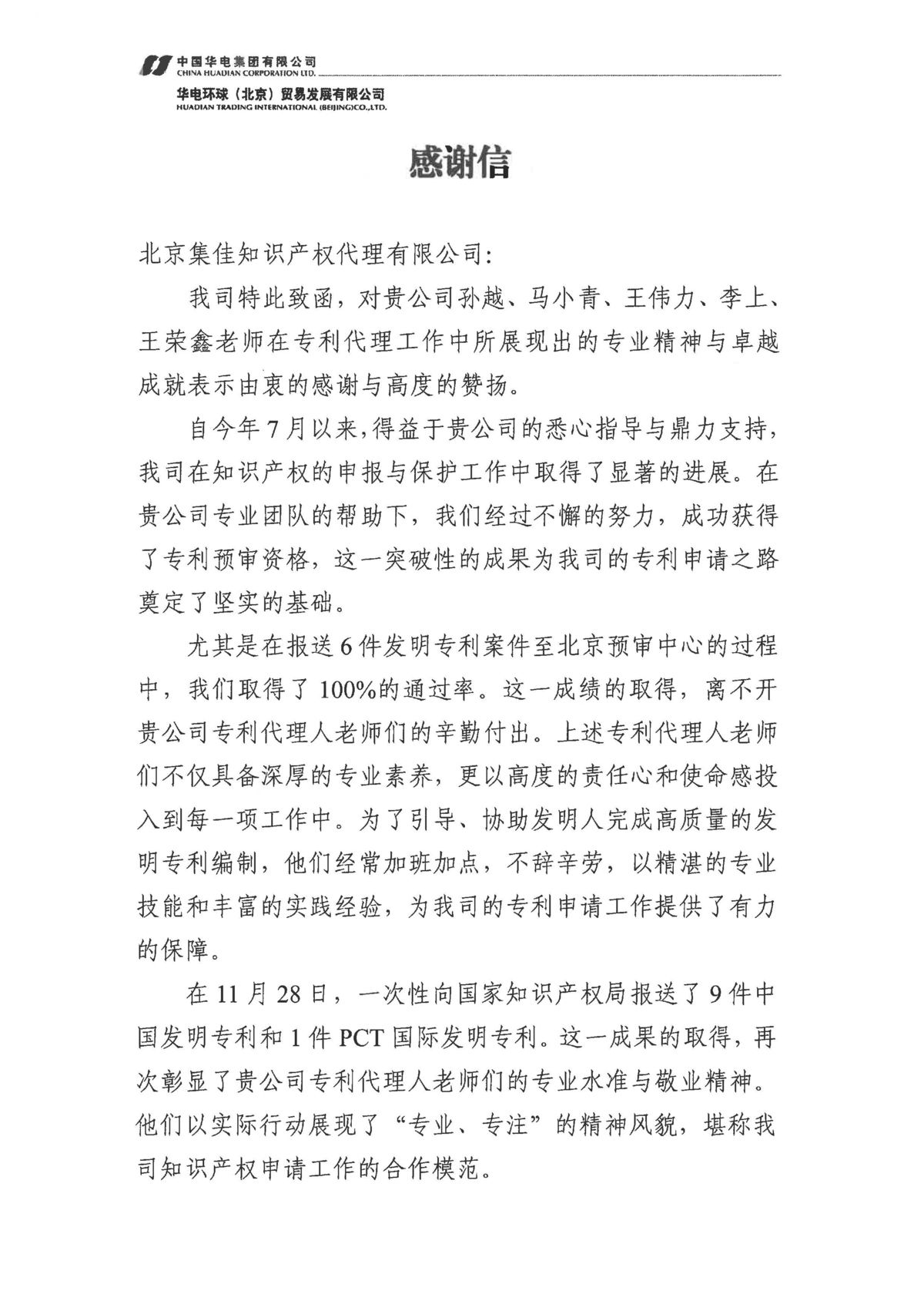 近日,集佳收到客戶華電環(huán)球(北京)貿(mào)易發(fā)展有限公司的感謝信,對集佳在知識產(chǎn)權(quán)申報與保護工作中給予的專業(yè)指導(dǎo)與大力支持表示由衷感謝,同時對集佳孫越、馬小青、王偉力、李上、王榮鑫等專業(yè)人員在專利代理工作中所展現(xiàn)出的專業(yè)精神與卓越成就表示高度贊揚!