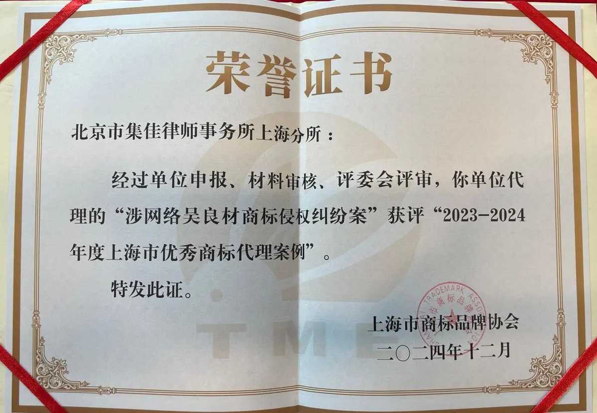 2025年1月7日,上海市商標(biāo)品牌協(xié)會(huì)召開第六屆會(huì)員代表大會(huì),會(huì)上表彰了被評(píng)為2023-2024年度“上海市優(yōu)秀商標(biāo)代理案例”及“上海市優(yōu)秀商標(biāo)代理案例提名”的案例,集佳上海分所的兩個(gè)案例成功入選。