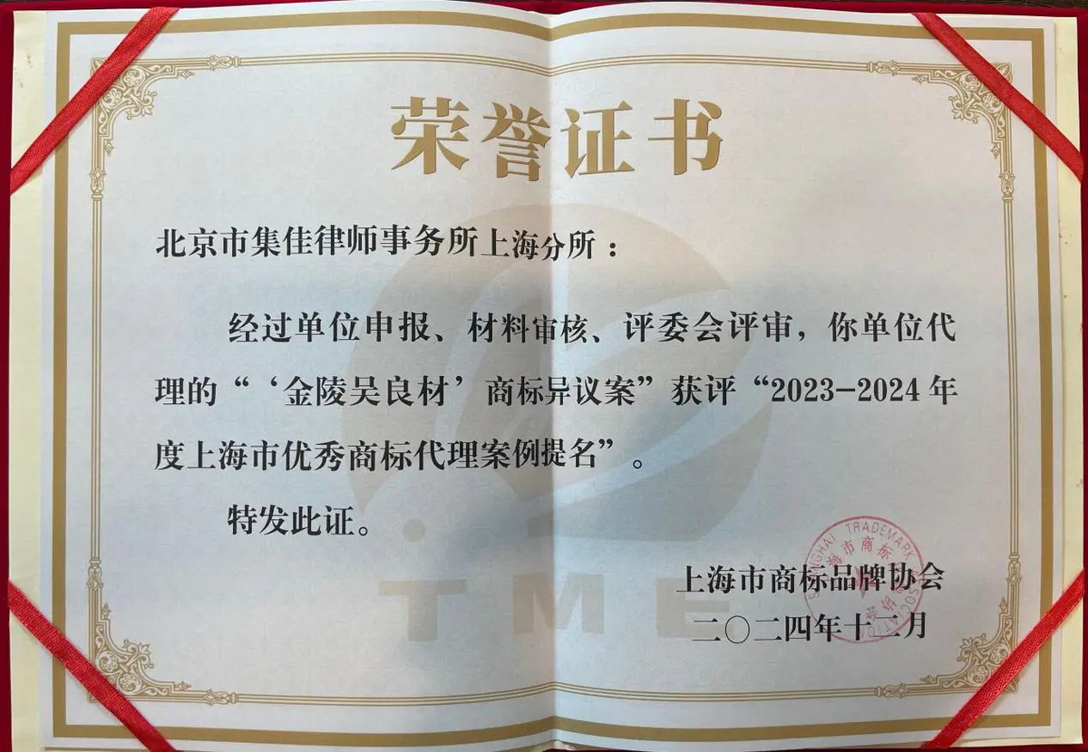 案例二“金陵吳良才商標(biāo)異議案”被評(píng)為上海市優(yōu)秀商標(biāo)代理案例提名