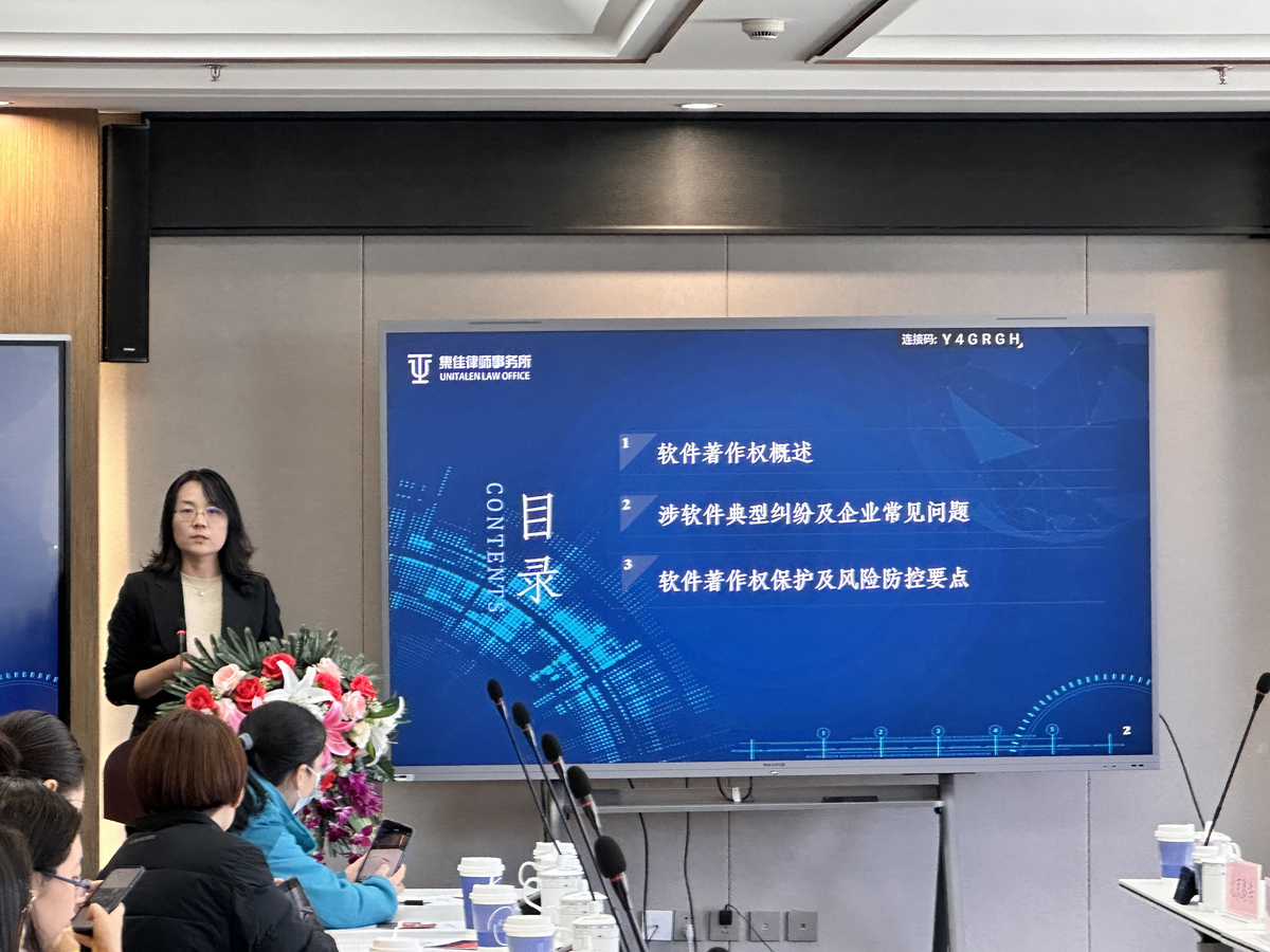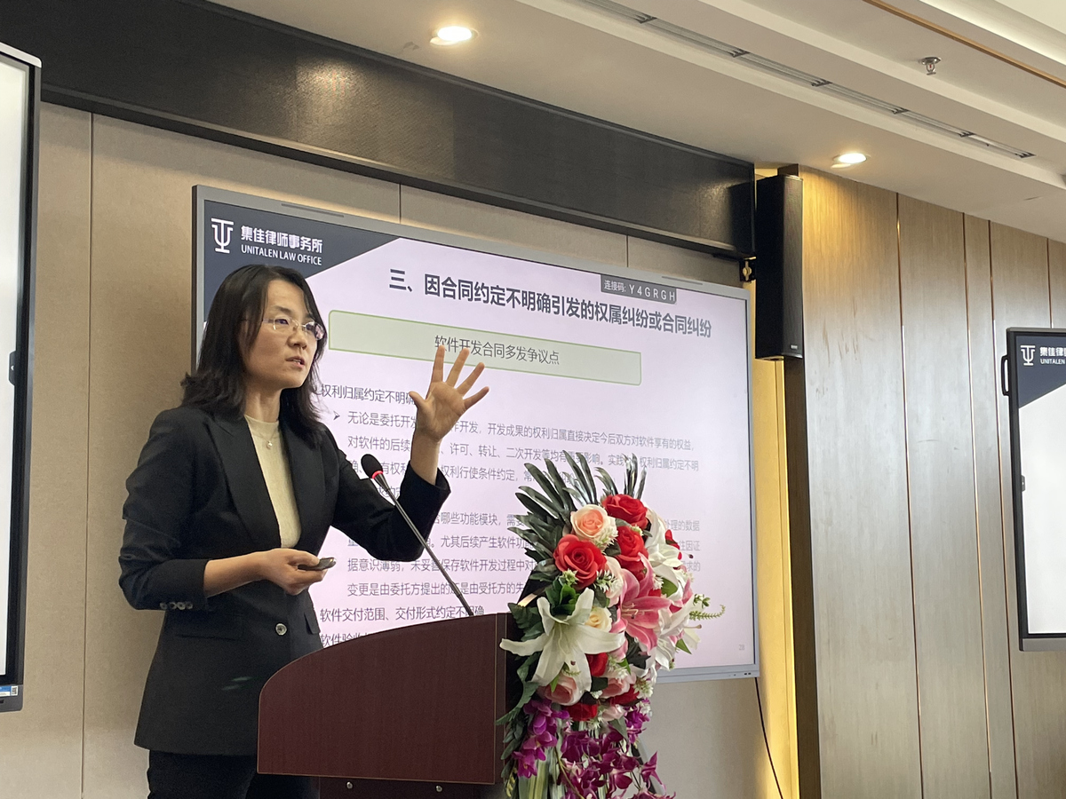 周丹丹律師在簡要介紹軟件著作權(quán)的保護(hù)范圍及保護(hù)期限、軟件著作權(quán)人享有的基本權(quán)利、常見的軟件著作權(quán)侵權(quán)行為等相關(guān)法律知識的基礎(chǔ)上,結(jié)合多個典型案例,對“員工離職引發(fā)軟件代碼抄襲糾紛”、“盜版軟件/超范圍使用商業(yè)軟件的侵權(quán)糾紛”、“因合同約定不明確引發(fā)的權(quán)屬糾紛或合同糾紛”等常見的軟件著作權(quán)糾紛類型進(jìn)行詳細(xì)解讀,深入分析各類糾紛中反映出的企業(yè)常見問題,進(jìn)而從軟件著作權(quán)的登記、軟件使用證據(jù)沉淀、軟件開發(fā)合同/合作開發(fā)合同核心條款的擬定、軟件采購、軟件投訴應(yīng)對、軟件源代碼管理等多個角度總結(jié)提煉出軟件著作權(quán)保護(hù)及風(fēng)險防控的實務(wù)要點,為與會企業(yè)提供了專業(yè)指引,內(nèi)容豐富詳實,實用性極強。